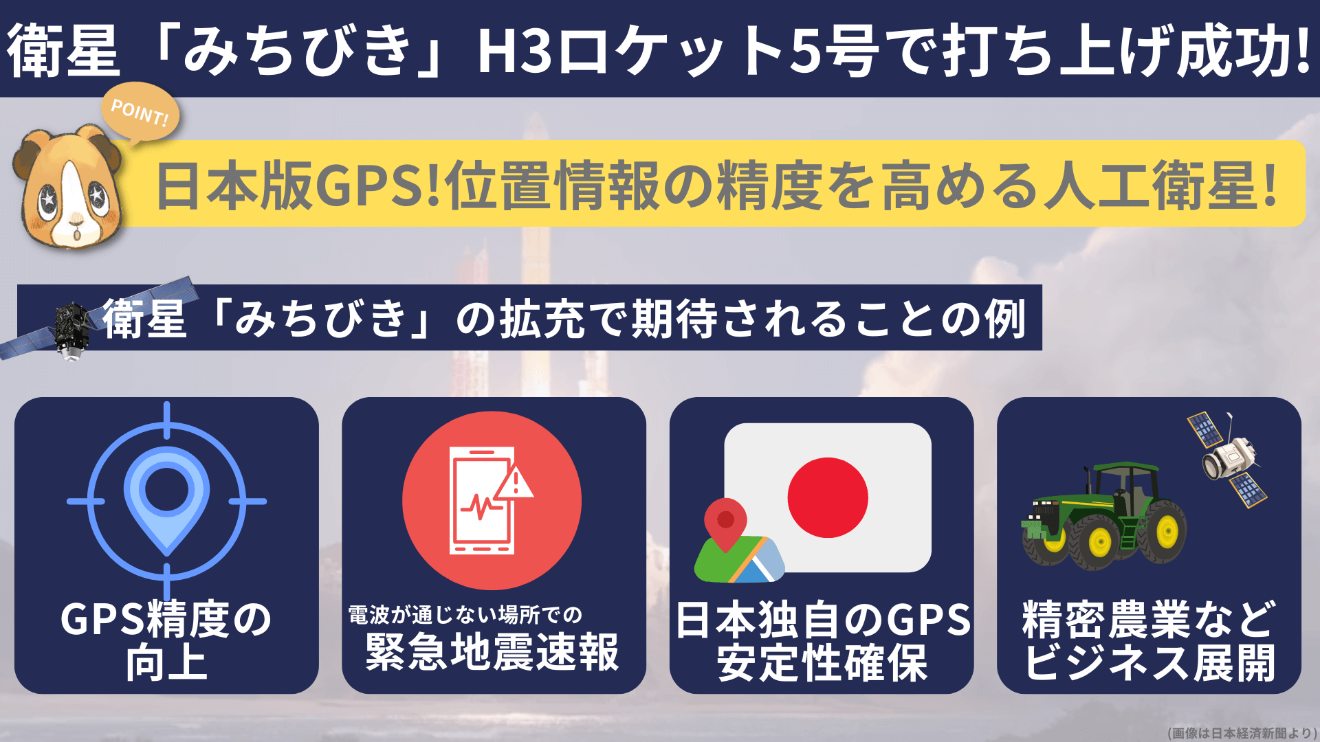 無事に打ち上げが成功してよかった!「みちびき」は、日本独自の準天頂衛星システム(QZSS)で、スマートフォンやカーナビの位置情報をより正確にするために使われておるんじゃよ。
