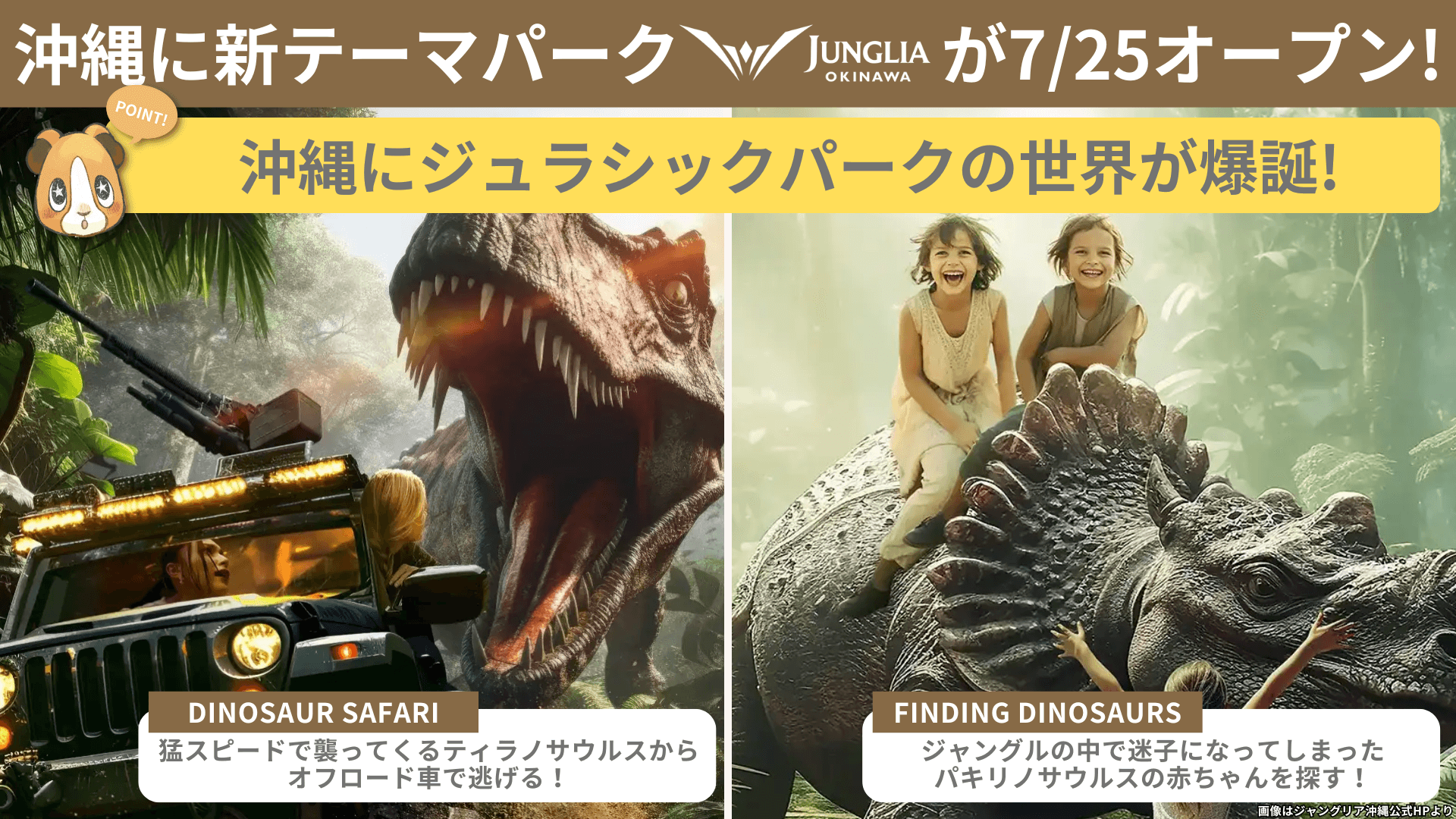 はかせ!沖縄にまるで「ジュラシックパーク」のようなテーマパーク、「ジャングリア沖縄」が2025年7月25日にオープンするそうです!恐竜が登場するアトラクションもあって、とてもワクワクします!